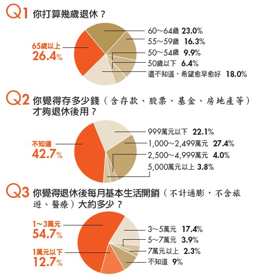 結果發現,和美國的情況非常接近,在問到打算幾歲退休時,有26.4%的受訪者勾選「65歲以上」才要退休,比率超過其他年齡選項,連同勾選「60~64歲」退休的人合計達49.4%;相較之下,只有18%的人「希望愈早愈好」。