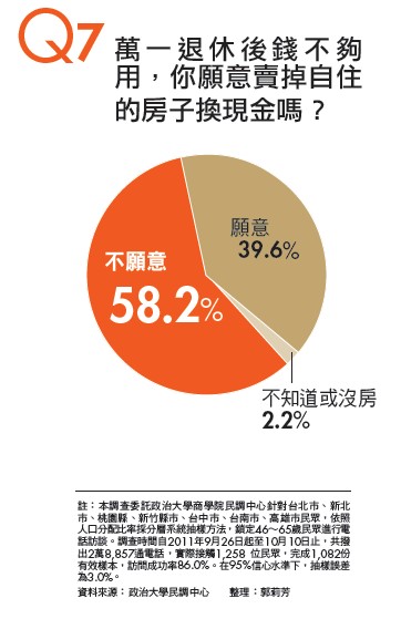 當被問到:「萬一退休金不足時,願意賣掉自住的房子換現金嗎?」竟有58.2%的受訪者不願意,只有39.6%的人願意賣房子籌退休金。